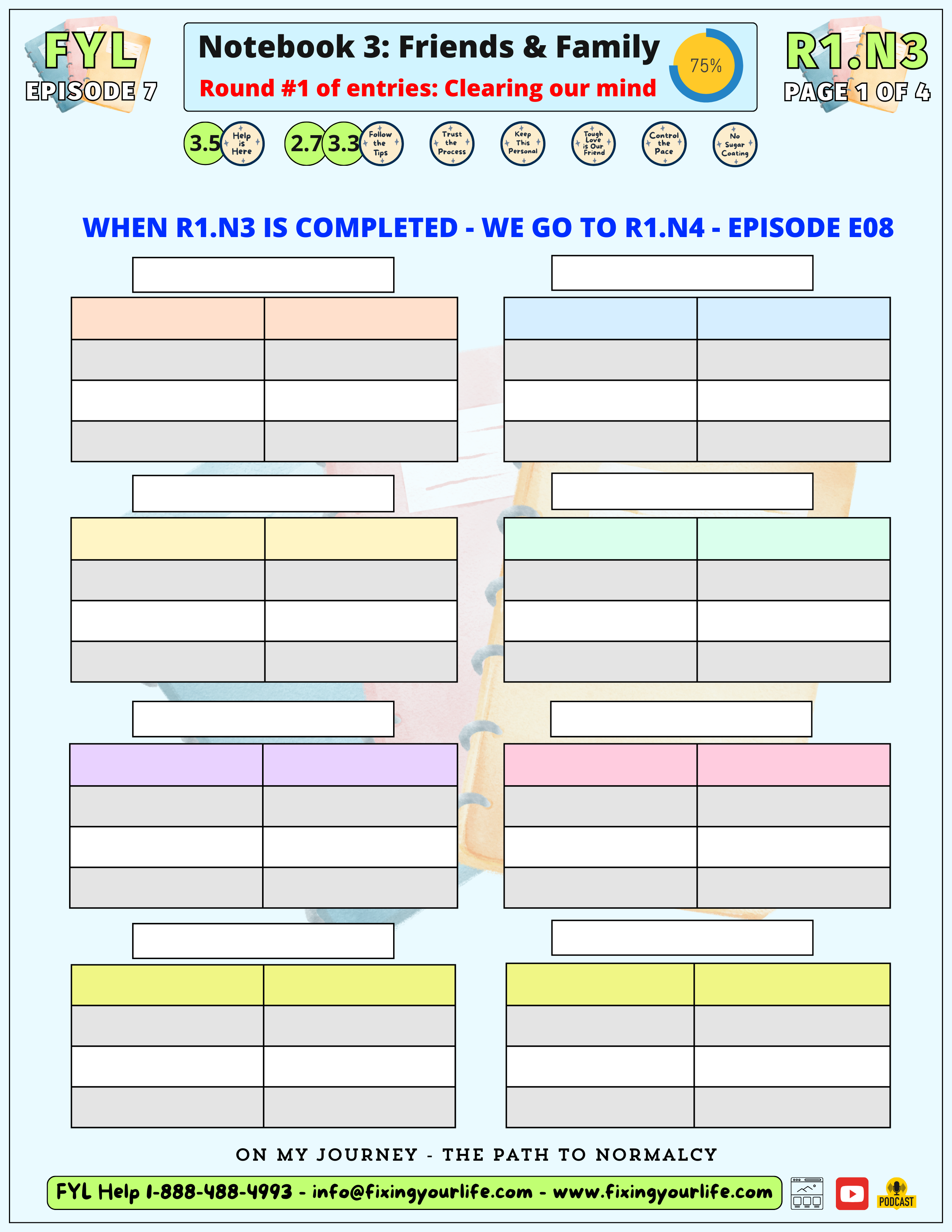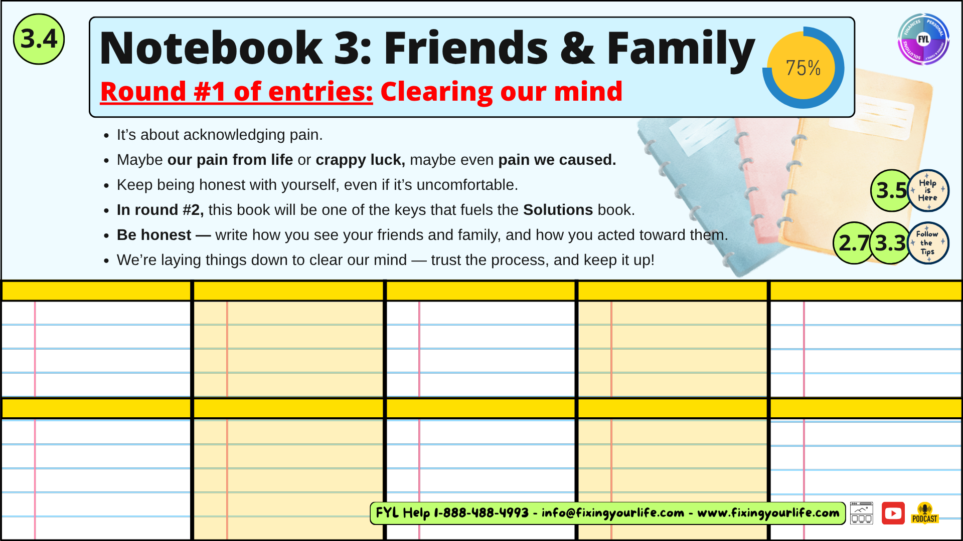 This is where we keep clearing the mind. The Friends & Family Notebook helps you see your relationships without pressure — just truth. Be honest and relaxed. You’re 75% through Round 1. We trust the process. The notebooks do much of the heavy lifting — so we can keep moving forward.