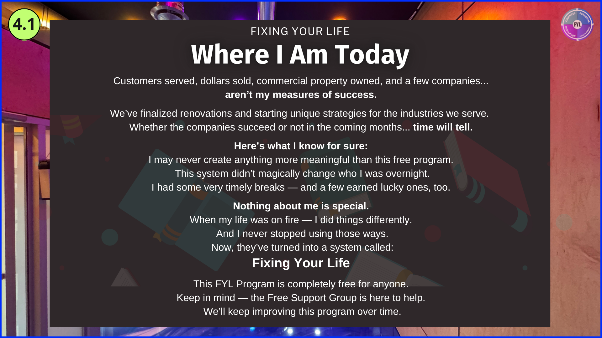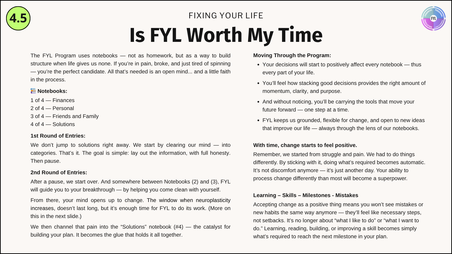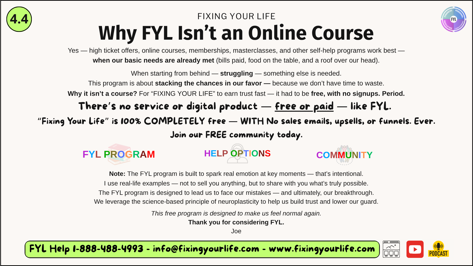 - 4.4 — Why FYL isn’t an online course