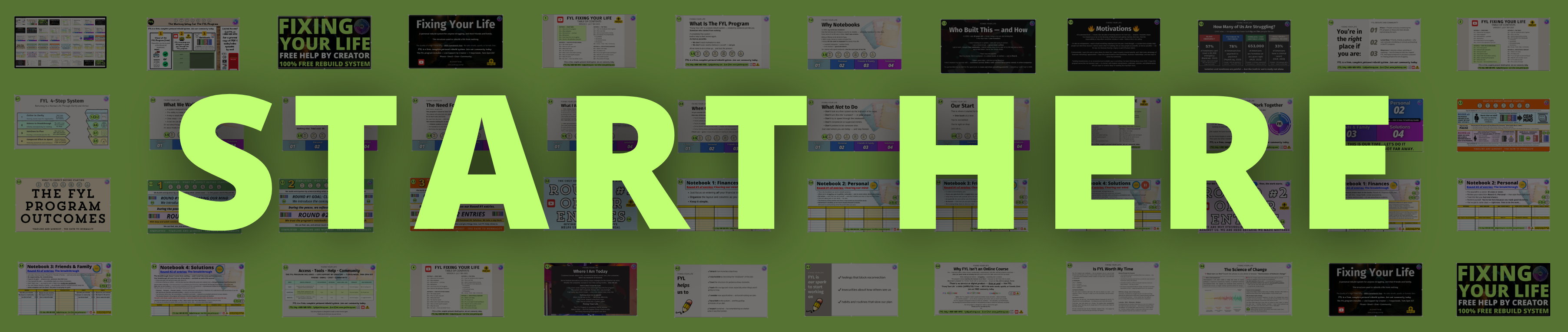 The FYL Program is a structured rebuild system designed to help you move from instability to stability — one clear step at a time. Start with the Program PDF and follow the four sections in order. The system is designed to do the heavy lifting, so you can focus on rebuilding with clarity and momentum.